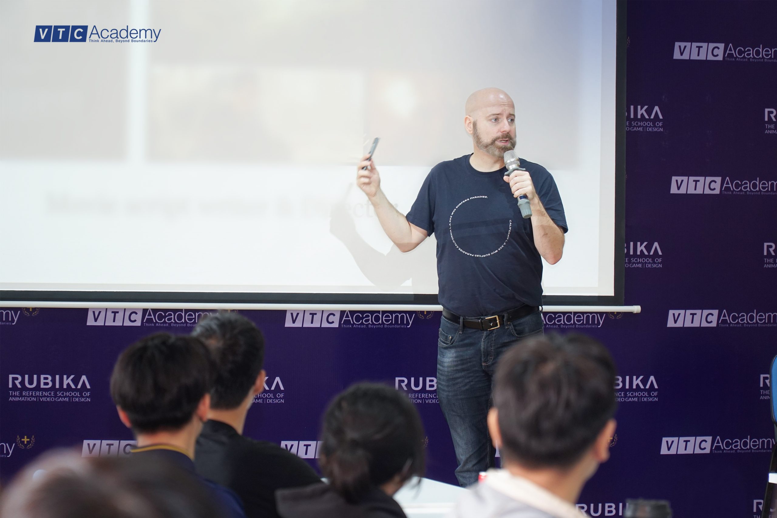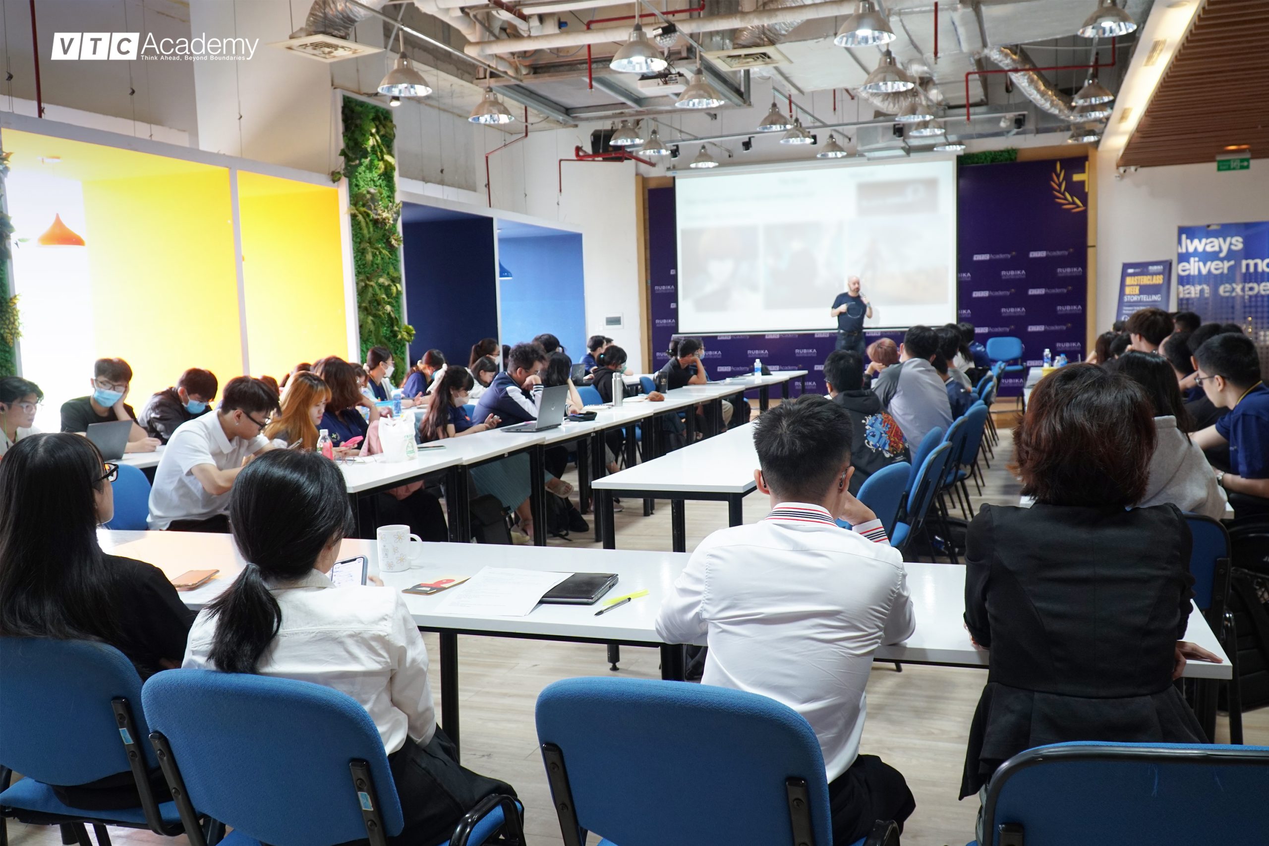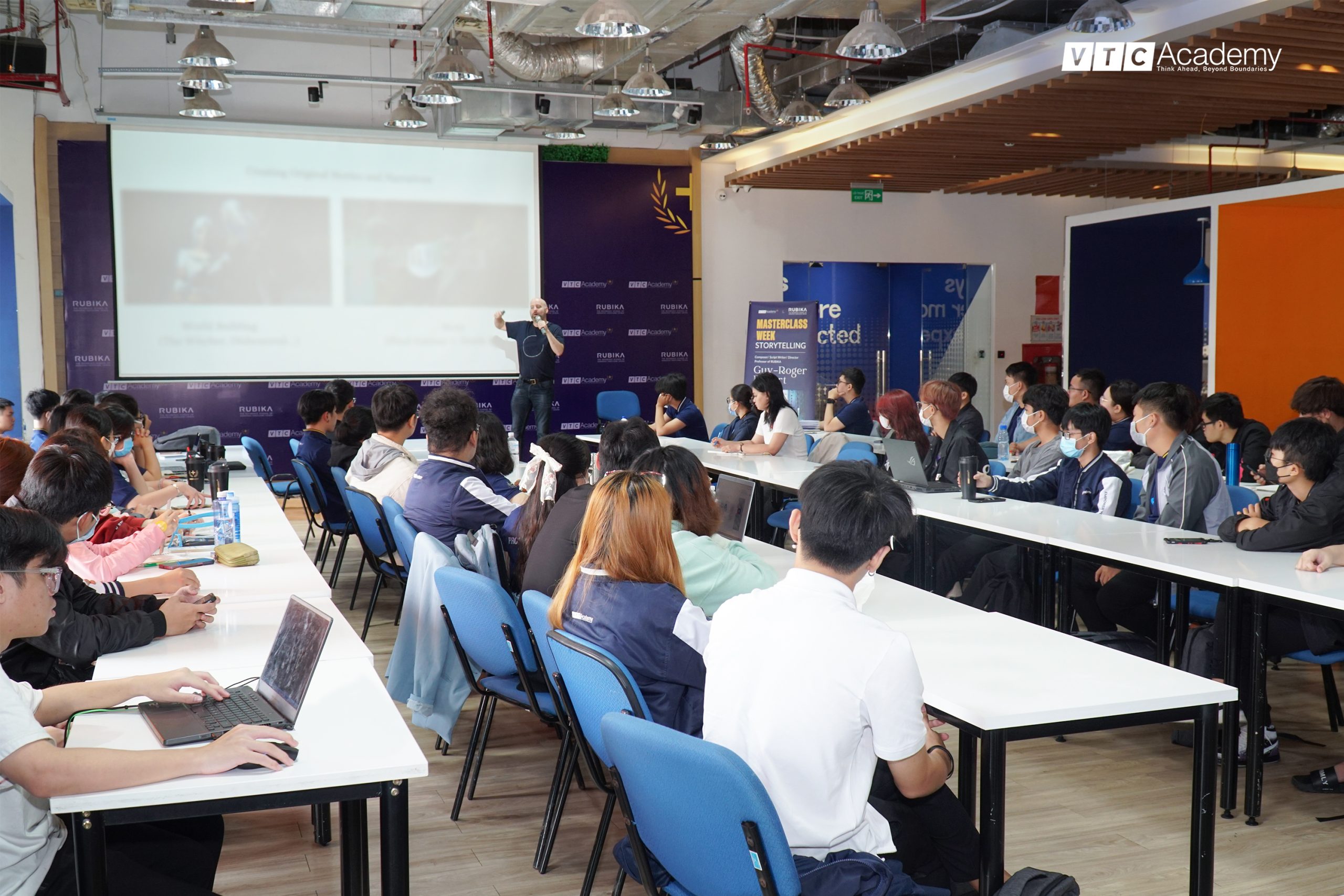 Sáng thứ Hai, ngày 20/03/2023 tại VTC Academy Plus chi nhánh TP. HCM, hơn 75 bạn học viên theo học chương trình liên thông quốc tế VTC Academy Plus ngành Kỹ xảo Hoạt hình 3D đã được học cùng chuyên gia – giảng viên thỉnh giảng đến từ RUBIKA: ông Guy-Roger Duvert | Đạo diễn, Nhà soạn nhạc, Biên kịch người Pháp trong chuyên đề đặc biệt “Chinh phục Nghệ thuật kể chuyện đỉnh cao”.