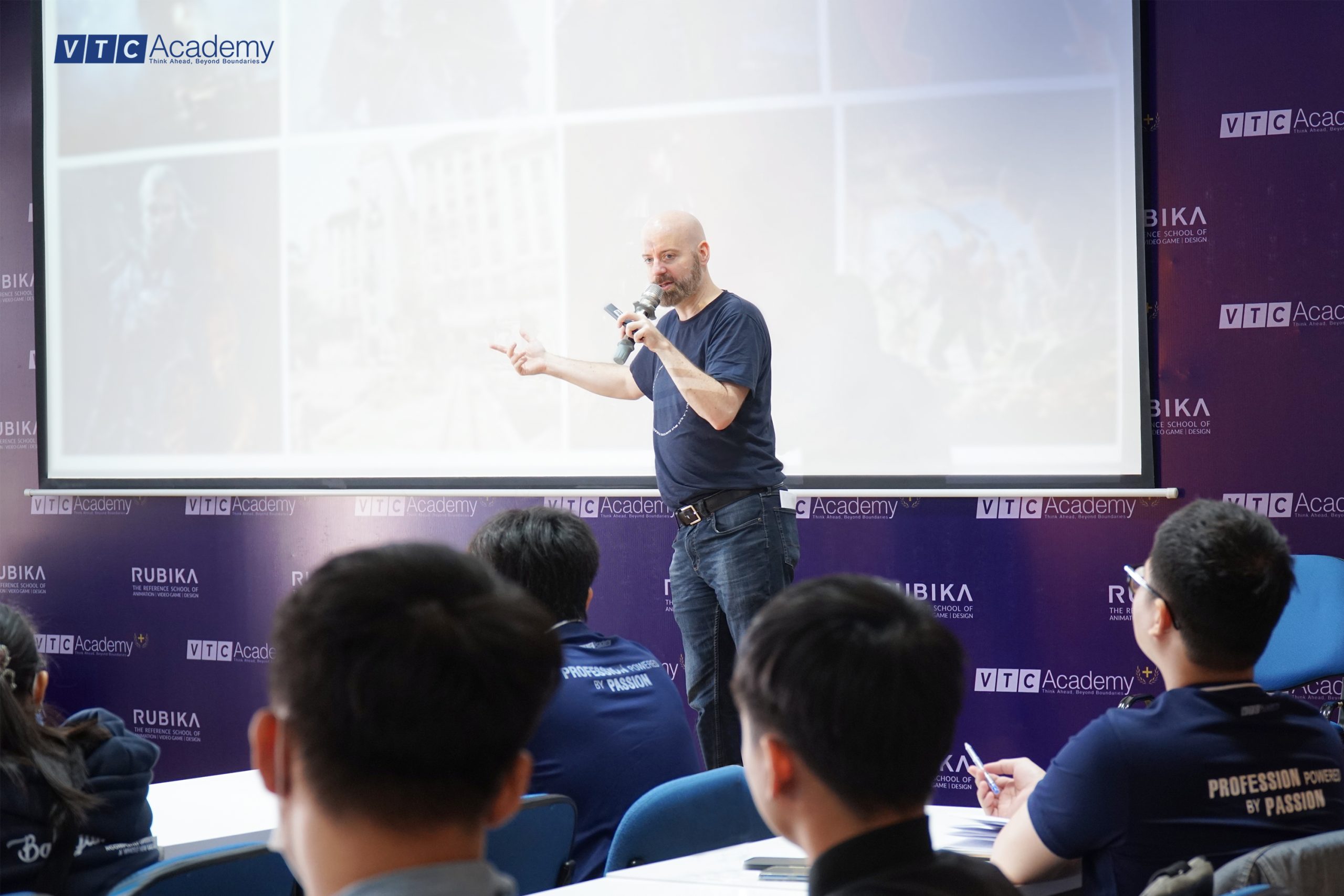 Sáng thứ Hai, ngày 20/03/2023 tại VTC Academy Plus chi nhánh TP. HCM, hơn 75 bạn học viên theo học chương trình liên thông quốc tế VTC Academy Plus ngành Kỹ xảo Hoạt hình 3D đã được học cùng chuyên gia – giảng viên thỉnh giảng đến từ RUBIKA: ông Guy-Roger Duvert | Đạo diễn, Nhà soạn nhạc, Biên kịch người Pháp trong chuyên đề đặc biệt “Chinh phục Nghệ thuật kể chuyện đỉnh cao”.