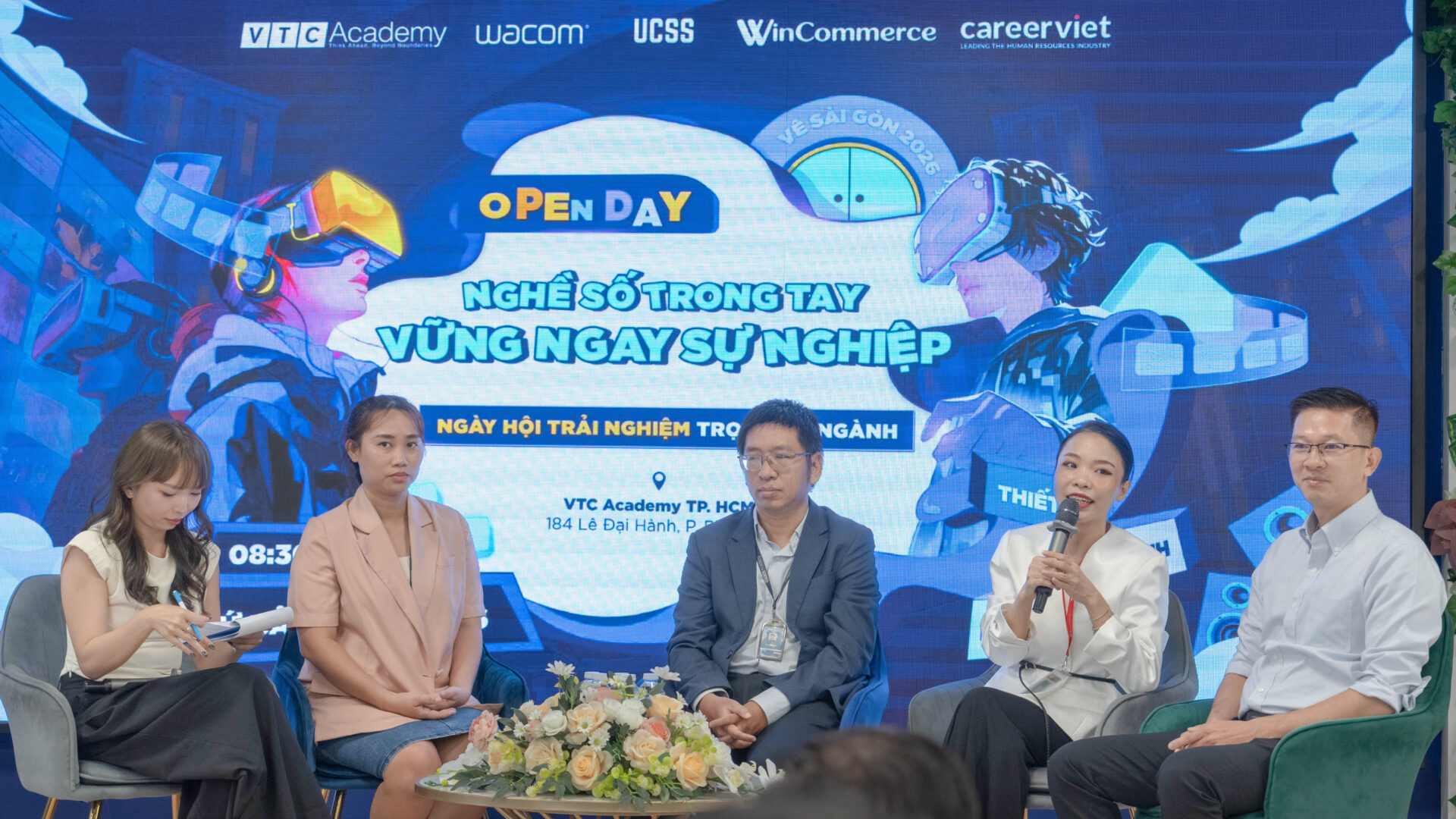 Thầy Nguyễn Thanh Hoàng – Giám đốc đào tạo toàn quốc tại VTC Academy (đứng thứ 4 từ trái qua) trao quà đến các diễn giả trong ngày hội Open Day 2026 tại VTC Academy TPHCM
