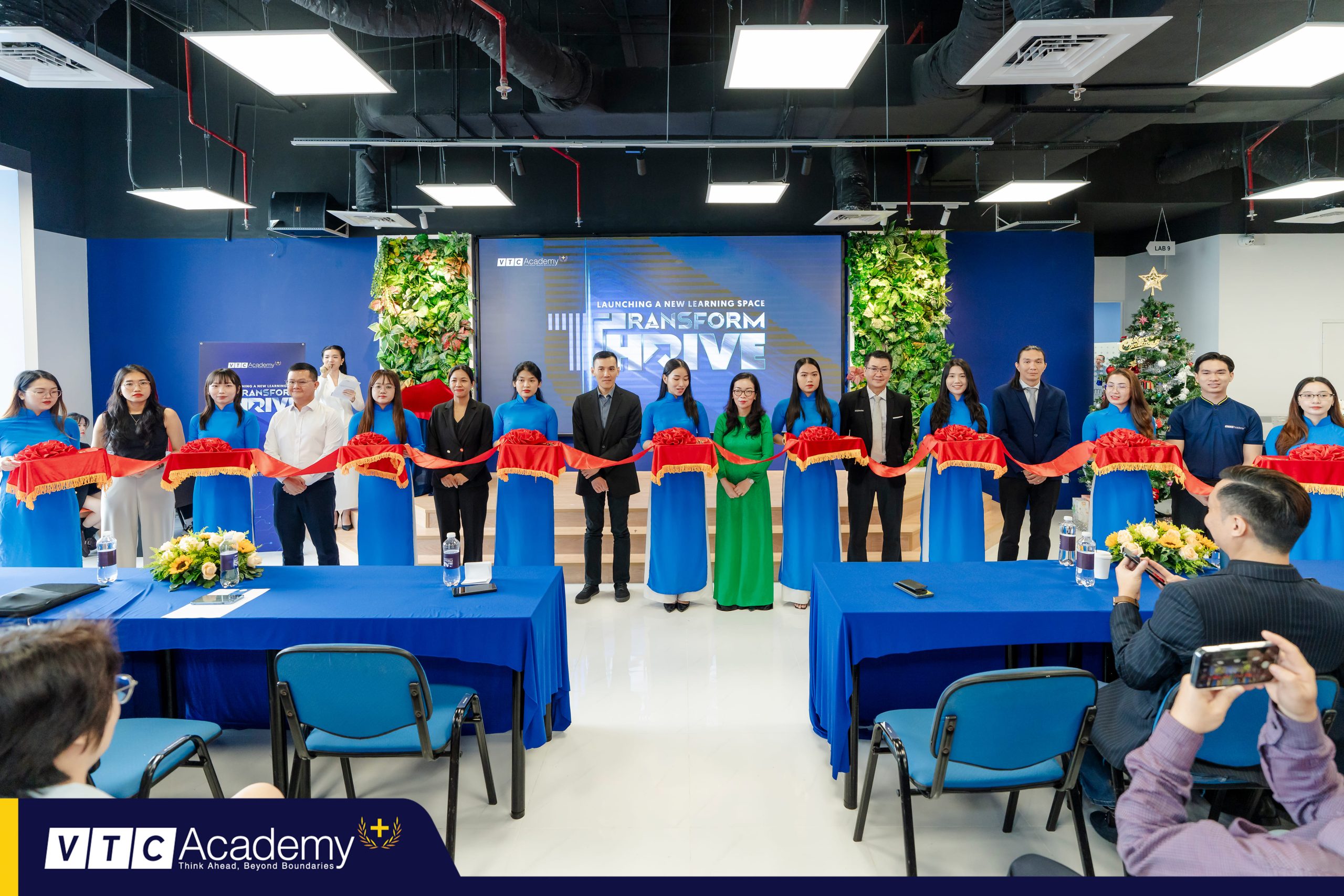Bà Lê Thị Khánh An và bà Lê Kim Minh Châu tham gia nghi thức cắt băng khánh thành ra mắt không gian học tập mới tại VTC Academy Plus trong khuôn khổ sự kiện “Transform & Thrive”